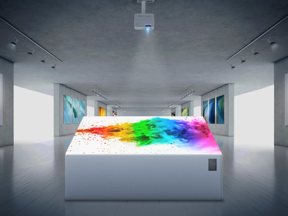 The projector can freely rotate at any angle vertically to aid with creative applications, allowing projection onto ceilings, walls, or angled signage.
