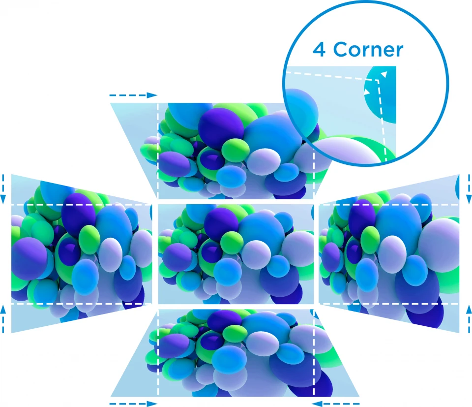 Horizontal and Vertical Keystone correction along with 4 corner adjustment features eliminate crooked or distorted images for a perfectly proportioned picture every time.